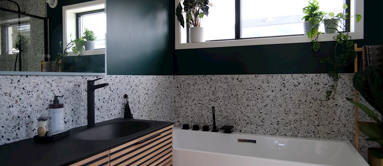 - Vi ønsket oss noe mer dempet og luksuriøst enn et hvitt og sterilt bad, og gikk for sorte detaljer og mørkt tre som sto godt i stil til terrazzo-fliser og grønne vegger.
